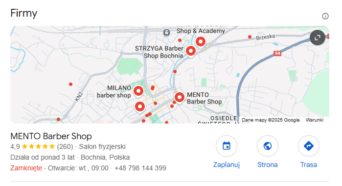 #1 on Google: Mento Barber reached the top position in Google Maps for Bochnia, attracting a constant flow of local clients who find the salon directly through search.
